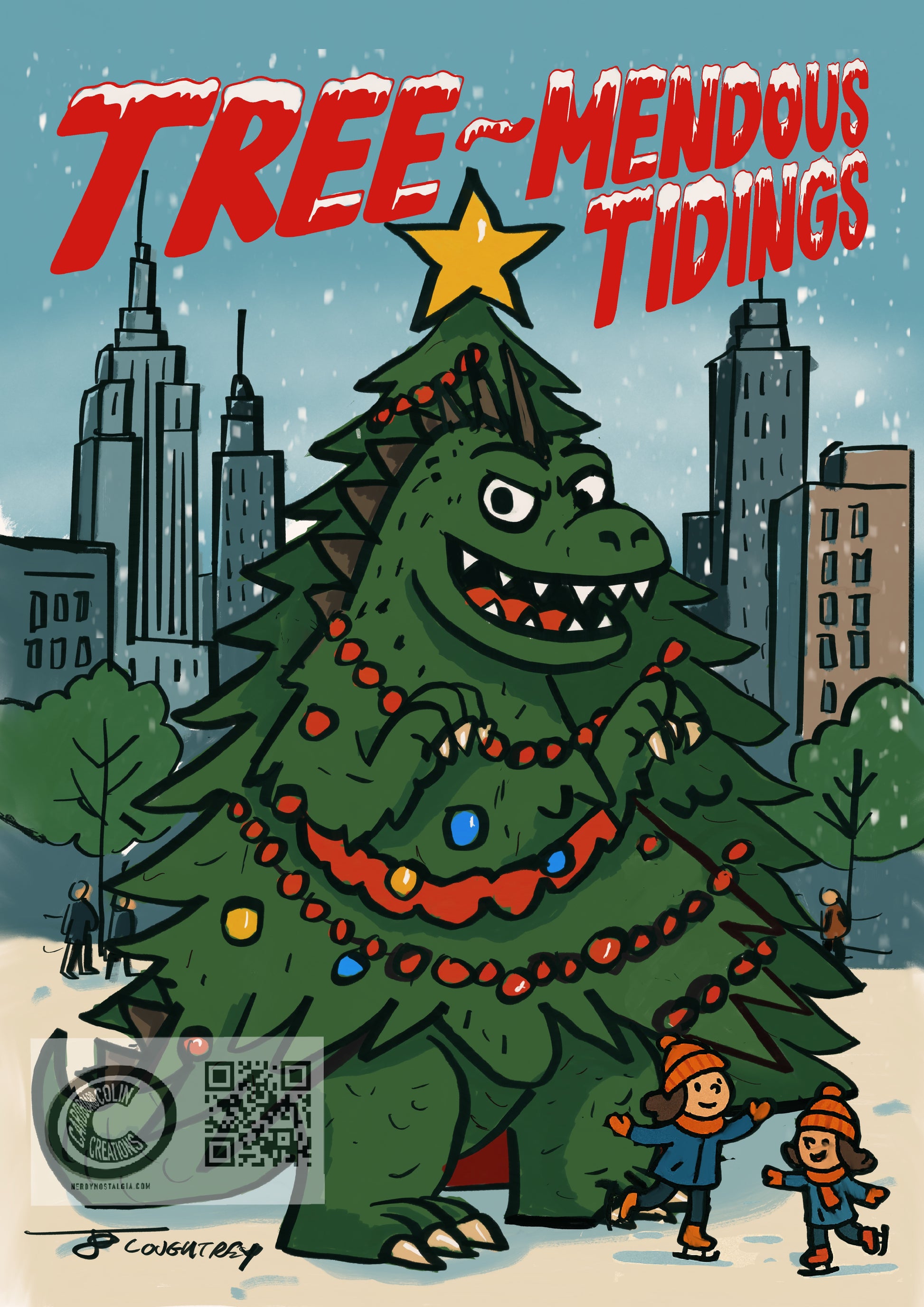 Deck the city with boughs of roar-ly! This festive “Tree-mendous Tidings” card features a hilariously disguised Godzilla dressed as a Christmas tree—complete with lights, baubles, and a shining star on top. As New Yorkers skate by unaware, this monstrous tree brings both holiday cheer and just a hint of chaos.