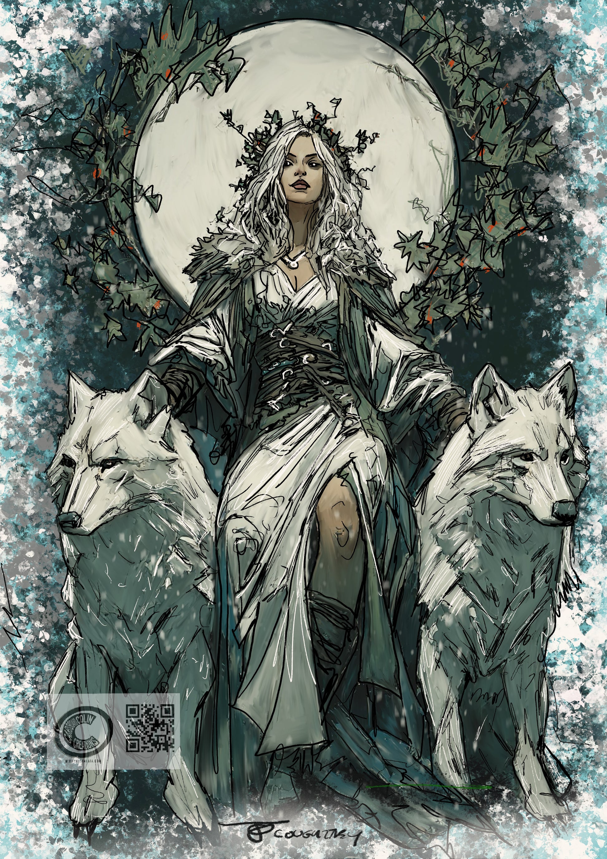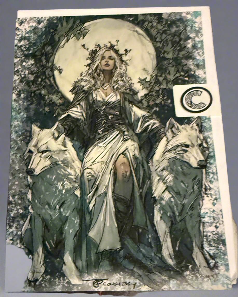 Send a touch of winter magic this festive season with the Yule White Witch greeting card. Featuring an original illustration by indie artist Cardboard Colin, this mystical design captures the serene strength of the White Witch, crowned with holly and ivy, flanked by two protective wolves, and illuminated by a glowing full moon. A perfect celebration of the Winter Solstice, Yule, or a magical alternative to traditional holiday cards.